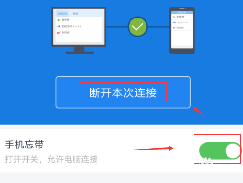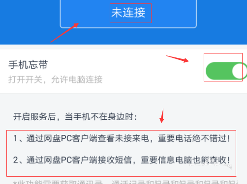 4、進入到“手機忘帶”頁面以后,我們可以看到現在是“未連接”狀態,我們把手機忘帶后面的按鈕點開就完成了手機端的操作。