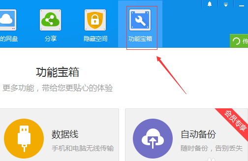 1、我們點擊電腦端百度云盤快捷方式,登錄與手機云盤一樣的賬號,登錄進入電腦端百度云盤頁面以后,我們在最上面找到“功能寶箱”并點進去。