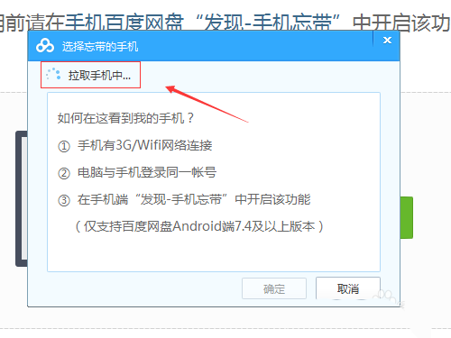使用“手機忘帶”功能需要滿足三個條件:手機有3G/wifi網絡連接。電腦與手機登錄同一百度云賬號。在手機端開啟“手機忘帶”功能。另外,該功能僅支持百度網盤Android端7.4及以上版本。