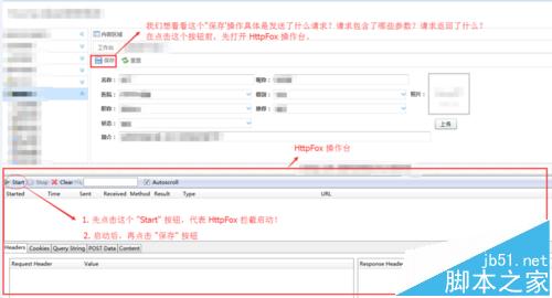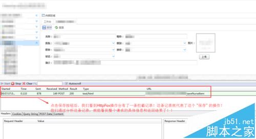 我們需要分析一個表單提交頁面,看看在提交表單的時候,我們發送了什么請求,具體有哪些參數。我們先啟動 HttpFox, 然后再點擊"保存"按鈕,我們會發現HttpFox 操作臺多出了一條記錄,這條記錄就代表這次請求操作。