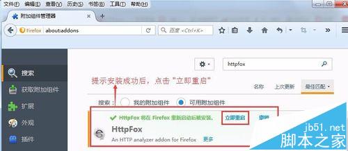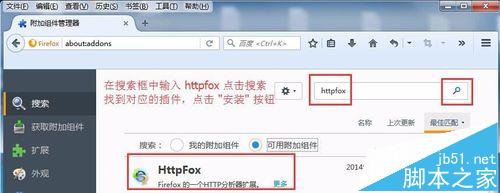 點擊 "工具"-->"附加組件" , 在打開的窗口中,搜索 "httpfox", 點擊 "安裝",提示安裝成功后,重啟瀏覽器!