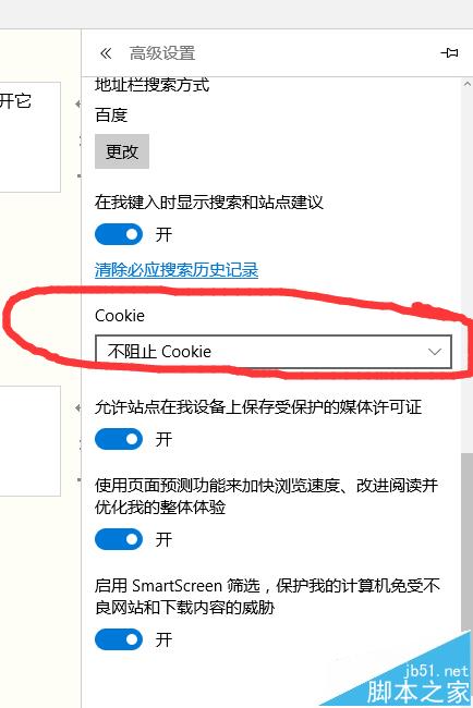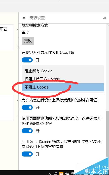 3、再次出現(xiàn)一個(gè)新框框,向下滾輪,可以看到cookie的選項(xiàng),選擇不阻止cookie,然后很多網(wǎng)站就可以登陸啦。
