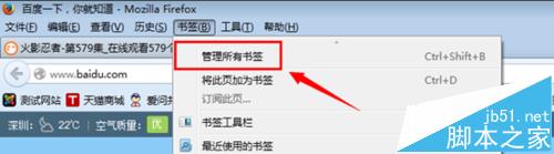 1、打開firefox瀏覽器,找到菜單欄(如果沒有菜單欄到空白處右鍵調(diào)出吧)如下圖,點擊“管理所有書簽”