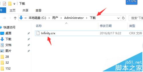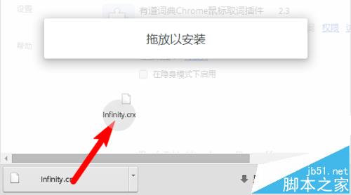 5、進入到拓展程序管理界面,然后從瀏覽器下載目錄將infinity.crx拖動至瀏覽器中心的【拖放以安裝】的框框內,也可以乳下圖,在瀏覽器下方直接將infinity.crx拖到上方進行安裝