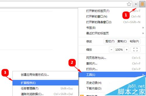 4、然后回到Chrome瀏覽器,再右上角X下面有一個三點的菜單,并點擊,找到【工具】→【拓展程序】點擊一下