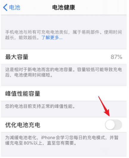iOS13系統中加入了電池優化功能,建議開啟這一功能。打開手機,進入設置界面,點擊【電池】——【電池健康】——【優化電池充電】,開啟電池優化功能。此外,如果你在外面不經常使用手機,可以打開低電量模式,保持電池的耐用度。
