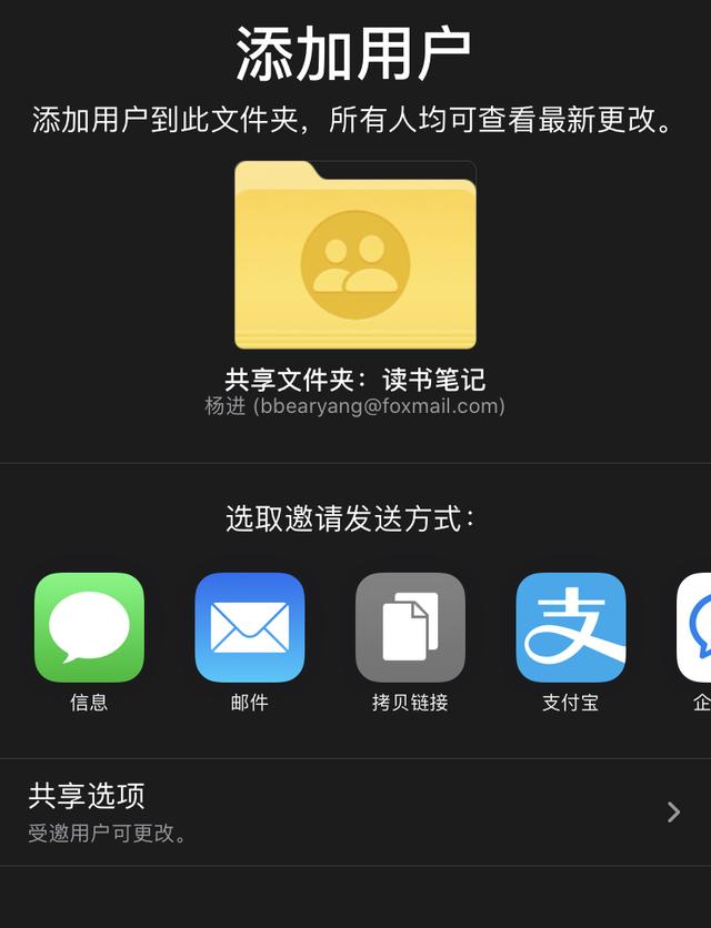 你可以選擇通過(guò)短信、郵件等方式對(duì)備忘錄文件夾進(jìn)行共享;注意,底部有一個(gè)【共享選項(xiàng)】,默認(rèn)受邀用戶(hù)可以更改備忘錄,如果你不想讓他人更改內(nèi)容,可以自行設(shè)置,