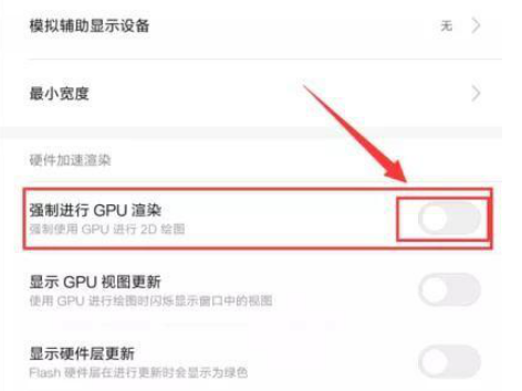 3.在“開發者選項"中向下滑動,即可找到"強制進行GPU渲染”的開關,打開即可。