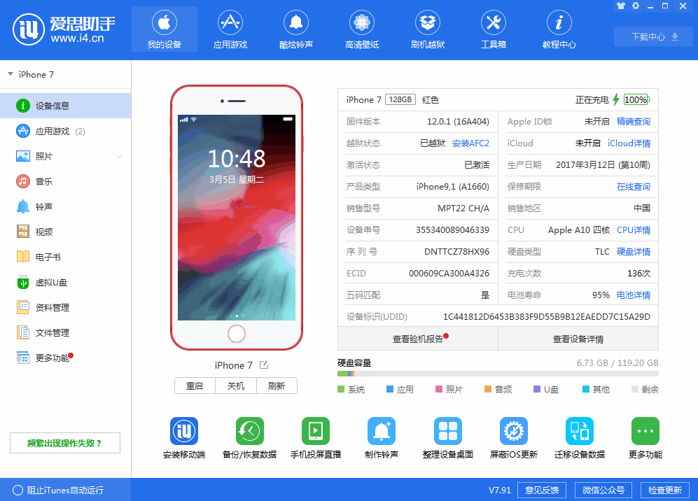 將iPhone手機連接到電腦,打開愛思助手,點擊上方的“刷機越獄”,進入“一鍵刷機”界面,