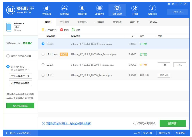 2、在可刷版本中選擇iOS 版本,點“立即刷機”,愛思助手會自動下載固件并刷機;