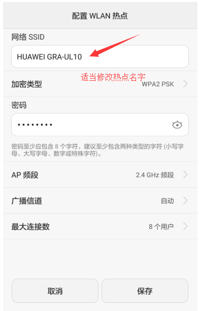 很多人喜歡將熱點名稱設置成中文或者特殊字符,但是有些特殊字符或中文會被接收熱點的手機識別成亂碼,導致搜不到手機熱點,其實只要把熱點名稱的SSID設置為字母加數字組合即可。