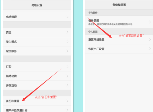 如果還是沒有解決問題,可以在手機“系統設置”中找到“高級設置”,點擊“備份和重置”,再點擊“重置網絡設置”,嘗試初始化網絡。有部分手機不提供“重置網絡設置”選項,可以嘗試“恢復手機出廠設置”,但是要先備份。