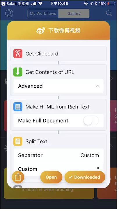 5、在小組件列表中點擊Workflow的「下載微博視頻」,