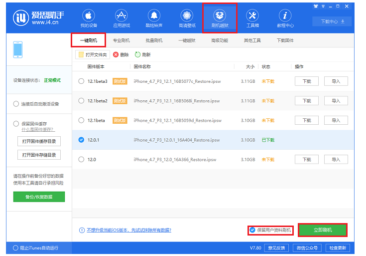 將設備連接電腦,并打開 PC端「愛思助手」,前往「刷機越獄」-「一鍵刷機」界面,愛思助手會自動推薦適合設備的固件版本,點擊「下載」即可下載對應版本固件。下載完成后,勾選「保留用戶資料刷機」,并點擊「立即刷機」。