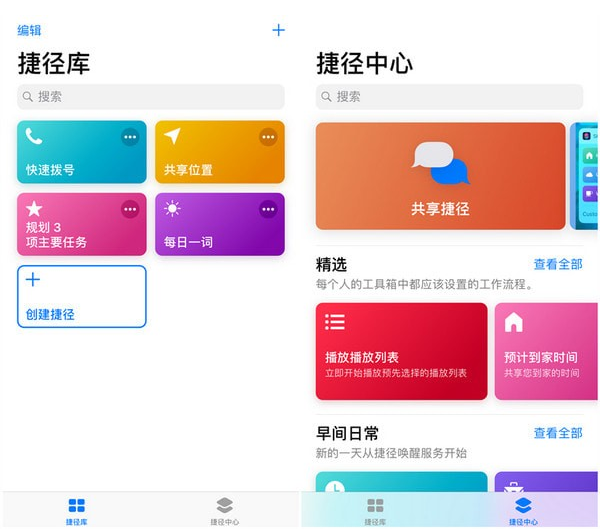 「捷徑庫」里面保存了已有的捷徑。「捷徑中心」則可以下載現存的捷徑(包括官方分享和他人分享的),這里有多個分類,你可以根據分類去尋找自己需要的捷徑。