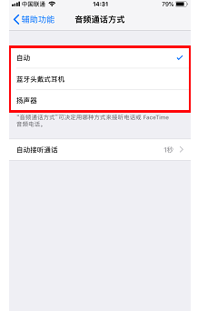 在音頻通話方式界面可以選擇通話接通時默認的接聽方式,可選耳機或揚聲器,也可以勾選自動,會根據當前狀態自動選擇接聽方式。