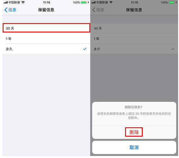 修改信息保留的時間,根據需要,選擇【30天】或【1年】選項,點擊【刪除】。