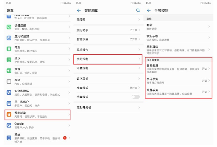 手機安裝程序太多了,有時候查找應(yīng)用太麻煩!這時候我們就可以使用指關(guān)節(jié)召喚術(shù),把躲在深處的應(yīng)用“召喚”出來,先進入設(shè)置>智能輔助>手勢控制中開啟字母手勢功能。