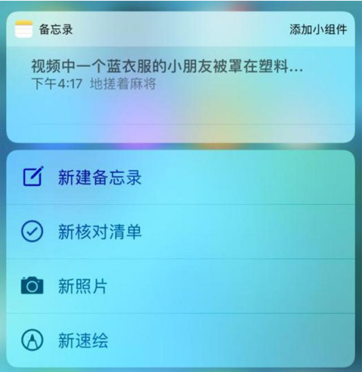備忘錄對于大部分人而言都是需要即開即用的,3D Touch在這點上做得很好。按壓備忘錄圖標,可新建備忘錄、核對清單、照片和速繪,選擇新照片之后會立即進入相機拍照,照片會作為附件保存在備忘錄中。在備忘錄列表中,也可以按壓對應的備忘錄條目,對其進行預覽,再次重壓即進入備忘錄的編輯界面。