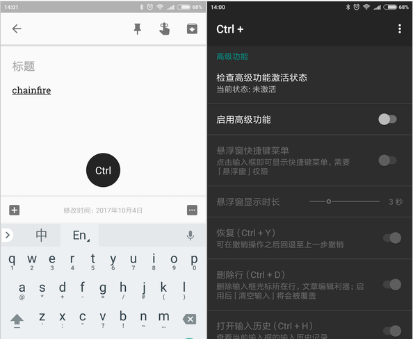 Ctrl+的功能還是比較豐富的,當你在安卓機上進行文本輸入、存在輸入光標的時候,Ctrl+的功能會自動激活。Ctrl+默認使用音量下鍵作為Ctrl鍵,不過其實你也可以自定義Ctrl鍵的觸發按鍵。這個APP要求將鍵盤調整到英文輸入的狀態,在中文輸入狀態特別是九宮格的中文鍵盤,APP是不生效的。切換到英文輸入法后,只要同時按住你設置的Ctrl鍵,然后再按下英文字母,就可以如同PC上一樣,觸發各種Ctrl快捷鍵了。
