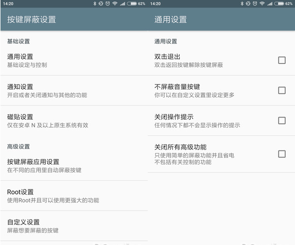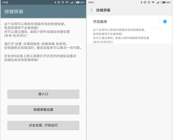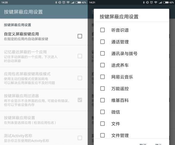 ,這款APP可以屏蔽手機的按鍵,以防誤操作。它也是通過輔助服務來實現相關功能的,使用的時候授予相應的權限即可。在APP當中激活服務后,手機的按鍵就會被屏蔽了。比較人性化的是,這款按鍵屏蔽APP可以設置只在某些應用開啟時屏蔽按鍵,這點還是相當不錯的。