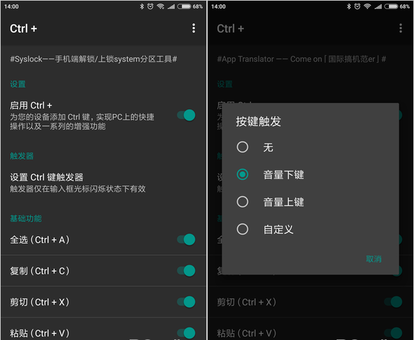 Ctrl+是一款來自個人開發者的安卓APP,它的原理是通過無障礙服務來接管安卓系統按鍵功能,從而讓某個指定的按鍵化身為Ctrl鍵,如此一來就可以在手機上使用各種Ctrl鍵的快捷鍵了。