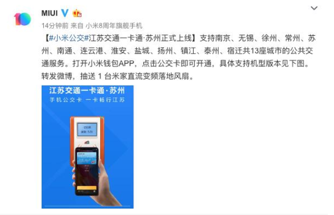 MIUI官博表示:小米公交已支持南京、無錫、徐州、常州、蘇州、南通、連云港、淮安、鹽城、揚州、鎮江、泰州、宿遷共13座城市的公共交通服務。打開小米錢包APP,點擊公交卡即可開通。