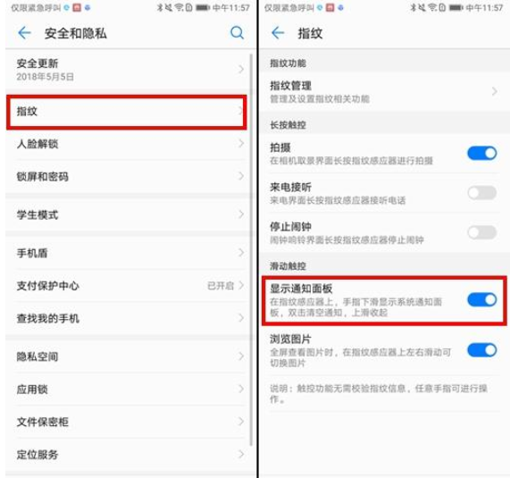 首先要先打開(kāi)指紋開(kāi)關(guān),然后點(diǎn)擊顯示通知面板,就可以如上圖這樣關(guān)閉消息通知了。