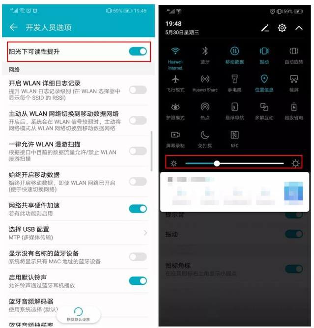 想不到吧,開發(fā)者選項(xiàng)還隱藏了“陽光下可讀性提升”這個功能,而且默認(rèn)是開啟的。室外太陽光太強(qiáng)烈,沒關(guān)系,系統(tǒng)會為你自動調(diào)節(jié)屏幕顯示亮度。另外,你也可以下拉通知欄,根據(jù)自己的需要,手動調(diào)整顯示亮度。