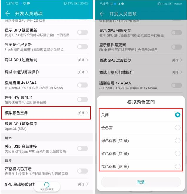 榮耀手機(jī)的開發(fā)人員選項(xiàng)里,還有“模擬顏色空間”這個功能,專門針對某些對顏色不敏感的人,隱藏得還挺深的吧。