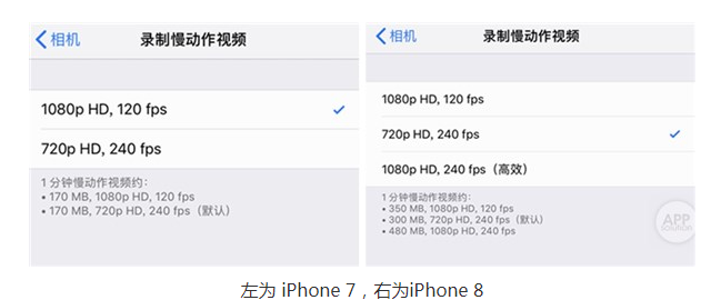 慢動(dòng)作錄制的格式分為1080p HD,120fps和720p HD,240fps。而iPhone 8以上的手機(jī)增加了一個(gè)高效格式,即1080p HD,240fps。