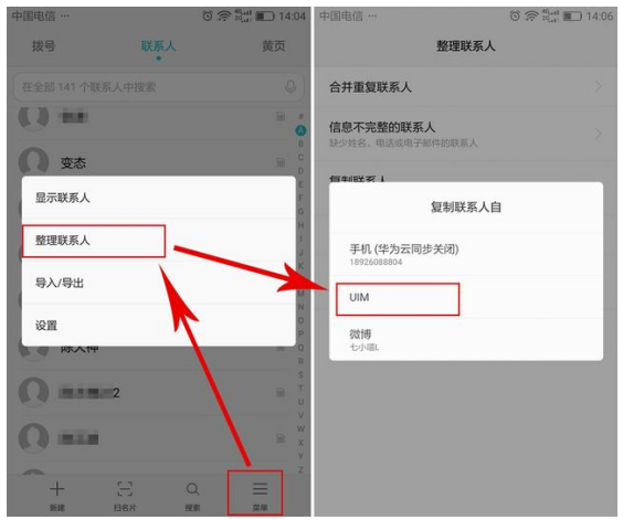 進入手機通訊錄,【菜單】-【整理聯系人】-【復制聯系人】,選擇【UIM】就代表是從SIM卡復制到手機,然后快速全選聯系人,一鍵復制就搞定了。