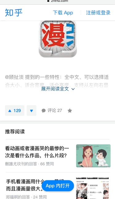 以知乎為例,移動版中除第一條以外,其他回答都被折疊了,附上一段“App內(nèi)查看”的提示。沒事,請求一下桌面版試試(在Safari可以長按地址欄右側(cè)刷新按鈕),就能看到那些被折疊的內(nèi)容了: