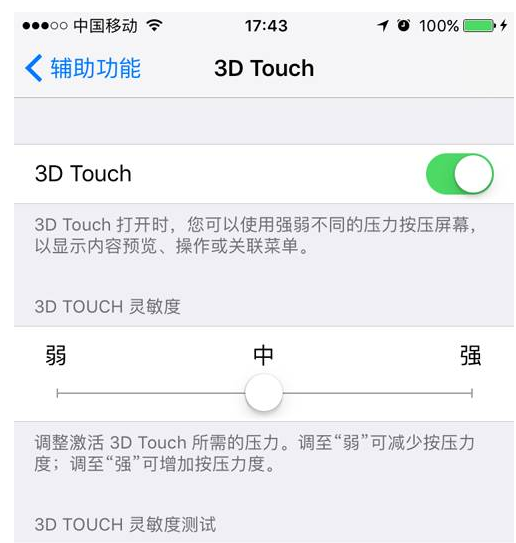 打開【設(shè)置】-【通用】-【輔助功能】-【3D Touch】,打開3D Touch功能,還可以調(diào)節(jié)靈敏度,如下圖所示: