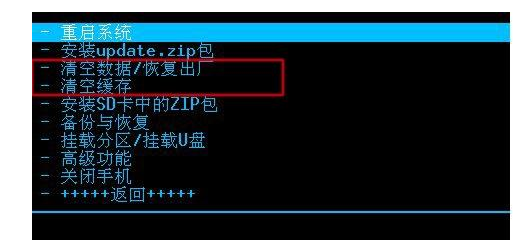 然后執行上圖中綠色區域的清空數據和清空緩存兩項,這兩項是必須做的,如果手機的鎖屏密碼忘了,執行這兩項后就可以清除手機密碼。