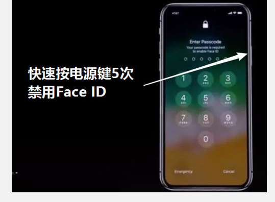 連續按下電源鍵五次,手機就會默認關閉Face ID,必須要輸入手機密碼才能解鎖,當然僅限本次禁用,下次依然可以通過Face ID解鎖。