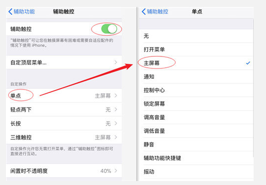 打開手機【設置】-【通用】-【輔助功能】-【輔助觸控】,開啟【輔助觸控】功能,點擊下方的【單點】,將對應操作改成【主屏幕】,然后將小白點移動到舊iPhone的Home鍵位置,就能替代Home鍵操作了:單點回到主菜單、雙擊進入后臺管理。