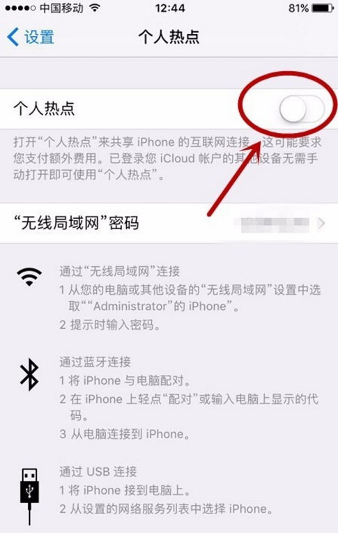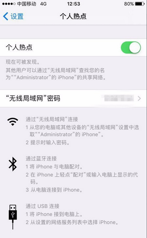 在“個人熱點”中將該功能啟用,并設置無線局域網密碼。