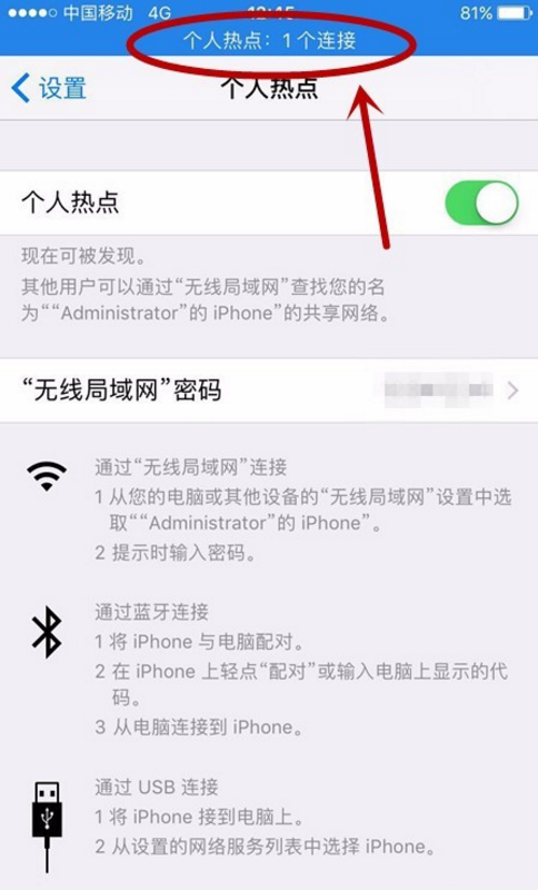 這時在個人熱點開啟的手機上方會有一個藍色眉頭,顯示有1個設備已連接。