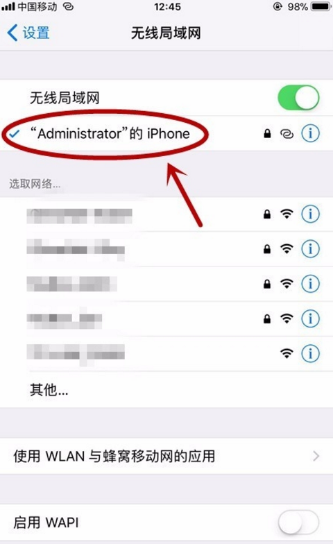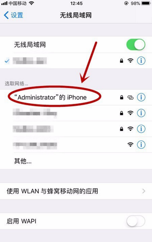 打開另一部手機的“無線局域網”,找到“Adiminstraor的iPhone”