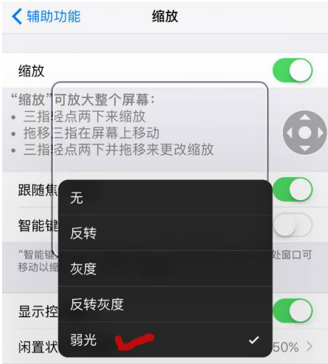 5、退出縮放,在輔助功能界面的最下方找到輔助功能快捷鍵,點擊進入,并選擇“縮放”這個選項,其他所有選中的選項都要取消。