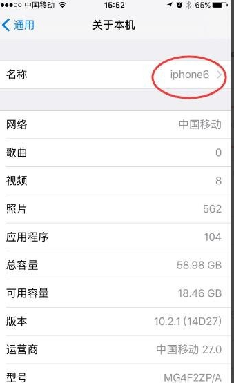 6、進入了“關于本機”界面,此時我們發(fā)現(xiàn)界面的第一行名稱,默認的就是該機型iPhone6,點擊進入。