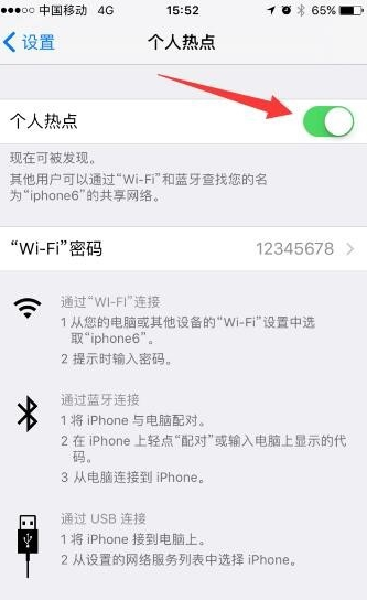 3、進入“個人熱點”菜單,向右滑動按鈕,即可打開WiFi熱點,并設置WiFi密碼為12345678。這樣蘋果手機的WiFi熱點就設置好了。