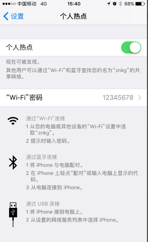 8、進入設置界面,點擊個人熱點,可以看到我們的WiFi名稱為znkg,WiFi密碼為12345678的WiFi熱點設置成功啦。