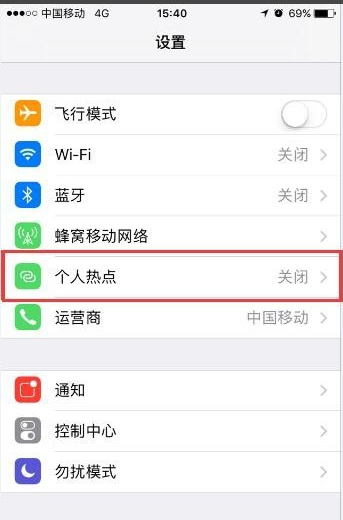 2、進入“設置”菜單,點擊“個人熱點”,