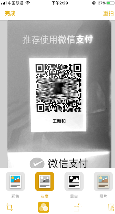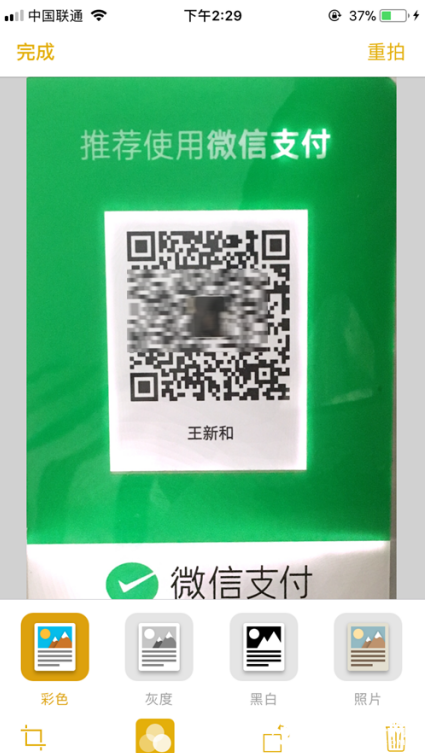 4、當(dāng)我們選擇繼續(xù)掃描之后,說明上一次的掃描已經(jīng)結(jié)束了,我們還可以對剛才拍攝的文件進行裁剪、加濾鏡,目前只有灰度、黑白與彩色三種濾鏡可選。