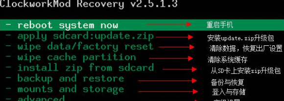 官方Recovery功能較少,第三方Recovery幾乎都包含了官方Recovery的全部功能,所以這里我們介紹第三方Recovery的功能,如果你是使用中文版那么請忽略,下面是英文版中文對照表。
