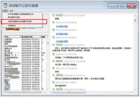 8、此時(shí),我們就可以在軟件界面上查看蘋(píng)果手機(jī)微信聊天記錄了。但是本文要說(shuō)明的是蘋(píng)果手機(jī)微信聊天記錄刪除了怎么恢復(fù)的問(wèn)題,很簡(jiǎn)單,我們只需要點(diǎn)擊下圖中的“恢復(fù)已刪除的微信聊天記錄”菜單即可。