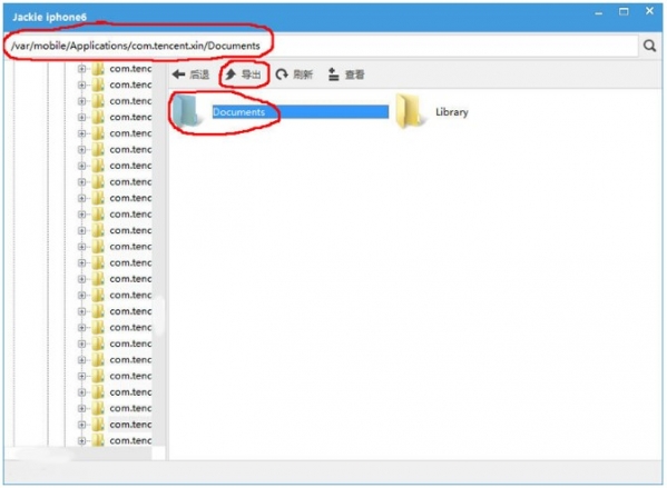 6,進(jìn)入var/mobile/Applications/com.tencent.xin/,然后選中Documents文件夾再點(diǎn)擊“導(dǎo)出”按鈕將其導(dǎo)出。