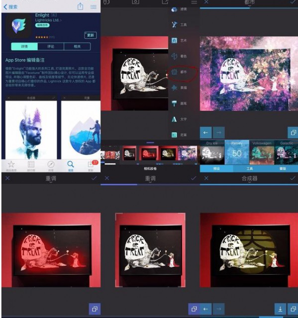 同樣作為全能型選手,具體的修圖就不介紹了,也是類似的調整參數值,講幾點 在我不用Snapseed時Enlight的吸引點。對我而言,Enlight的藝術模板里的都市,是最大的賣點!感受一下效果圖啊。也可以看到Enlight里每一個濾鏡也都是可以用蒙版的,有蒙版的APP才是好APP,請牢牢記住這一點。第二個賣點,就是Enlight里的重調功能,你可 以先鎖定圖片中不需要移動的地方,再進行垂直、水平擠壓或者拉升,是不是很炫酷。上圖感受一下。第三個賣點么就是雙重曝光了,在工具下設的合成器可以完 成,這里就不做詳細的介紹了,后面有對雙重曝光專門進行介紹,只放圖看一下功能。